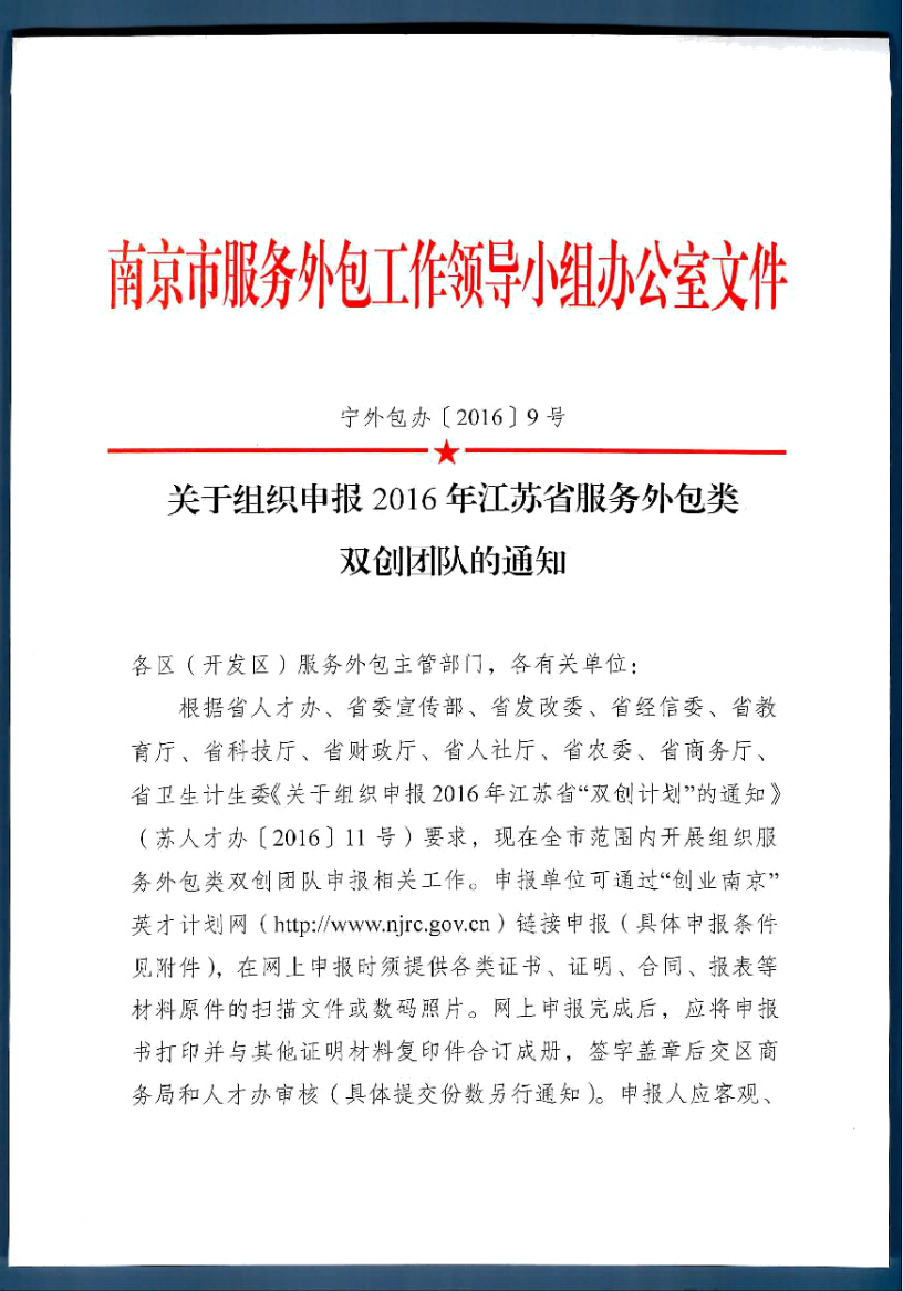 關(guān)于組織申報2016年江蘇省服務(wù)外包類雙創(chuàng)團(tuán)隊(duì)的通知