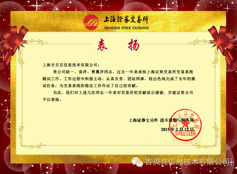 近日,吉貝克喜獲上海證券交易所的表揚(yáng)信。上證所高度肯定了吉貝克團(tuán)隊的工作成績。吉貝克在2014年承擔(dān)上證所的交易系統(tǒng)測試工作,以嫻熟的技術(shù)、優(yōu)質(zhì)的服務(wù)為前提,以為客戶創(chuàng)造最高價值為己任,嚴(yán)把產(chǎn)品質(zhì)量,為交易系統(tǒng)的穩(wěn)定運(yùn)行做出了突出的貢獻(xiàn)。信中特別點(diǎn)名表揚(yáng)了我司陸一、袁洋、曹翼翔同志,稱贊這三位同事積極主動、認(rèn)真負(fù)責(zé)、團(tuán)結(jié)同事。