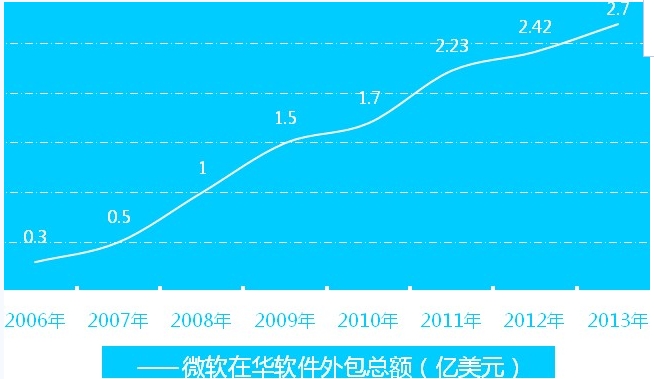 -過去幾年里,微軟持續(xù)增加對(duì)中國(guó)的全球軟件外包支出,具體金額從2006財(cái)年的3,000萬(wàn)美元飆升至2013財(cái)年的2.7億美元(如下圖),僅七年時(shí)間便增長(zhǎng)了9倍。